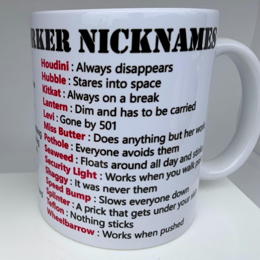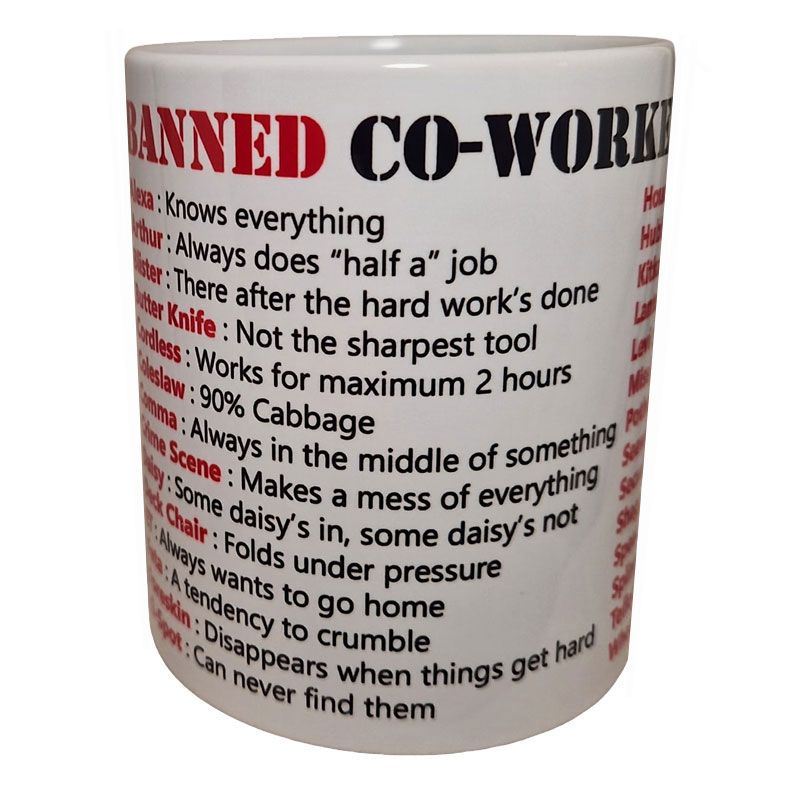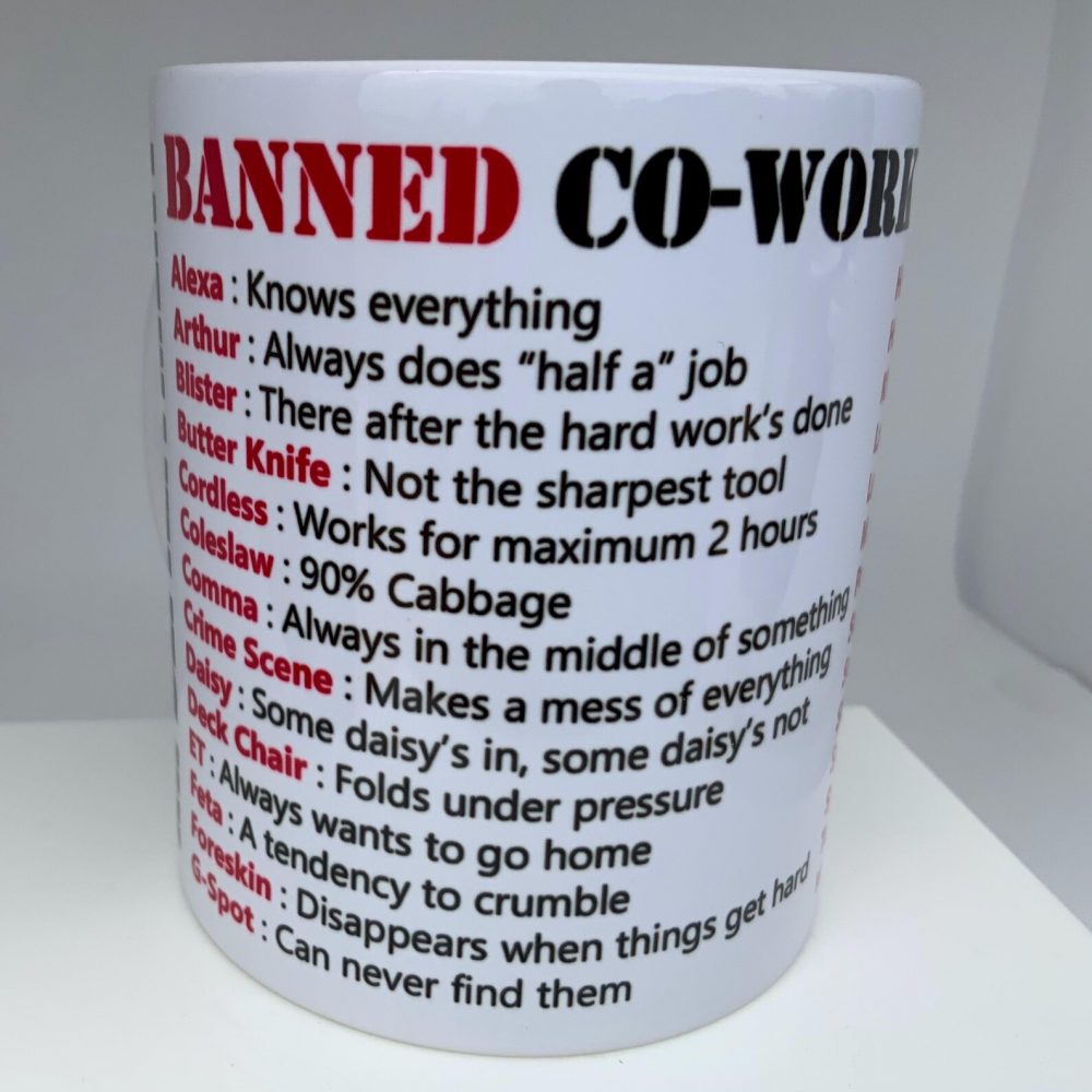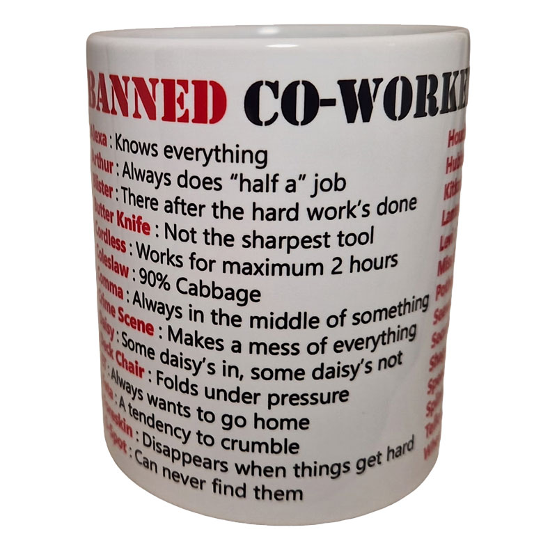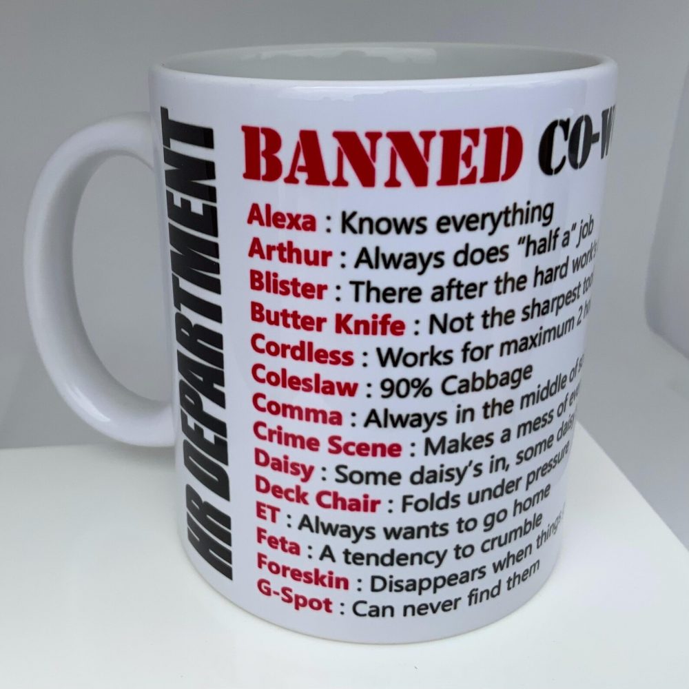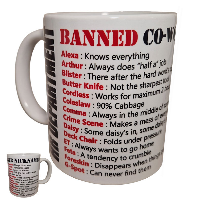 This mug features the stamp of ‘HR DEPARTMENT’ with the text ‘Banned Co-Worker Nicknames’ followed by a list.