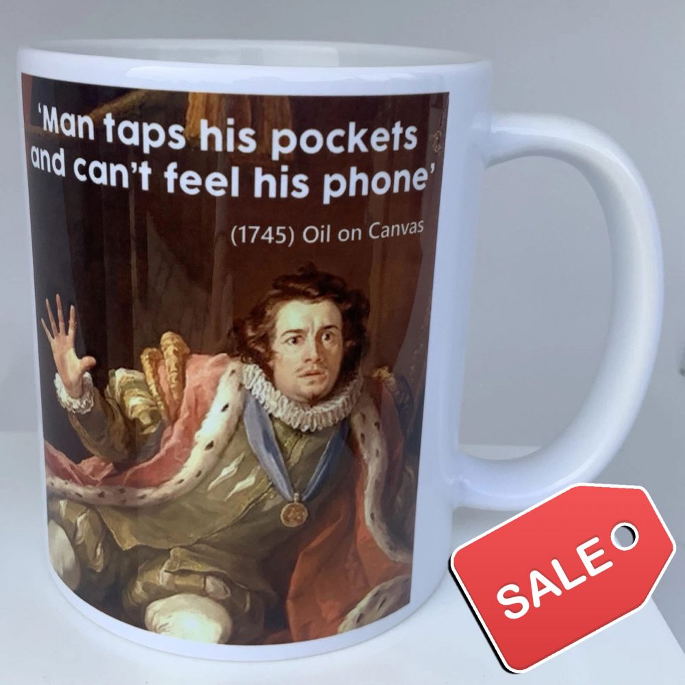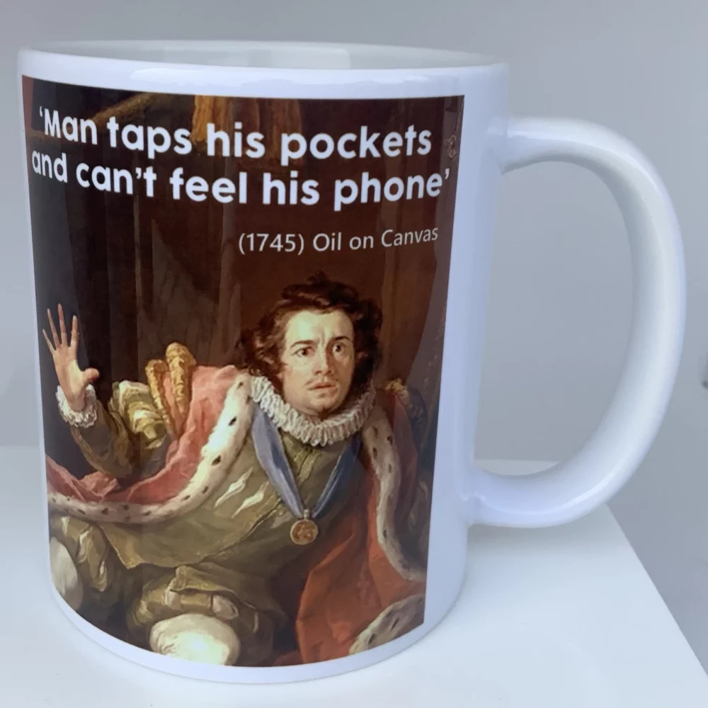 This mug features a picture of a man with the text ‘Man taps his pockets and can’t feel his phone – (1745) Oil on Canvas’.
