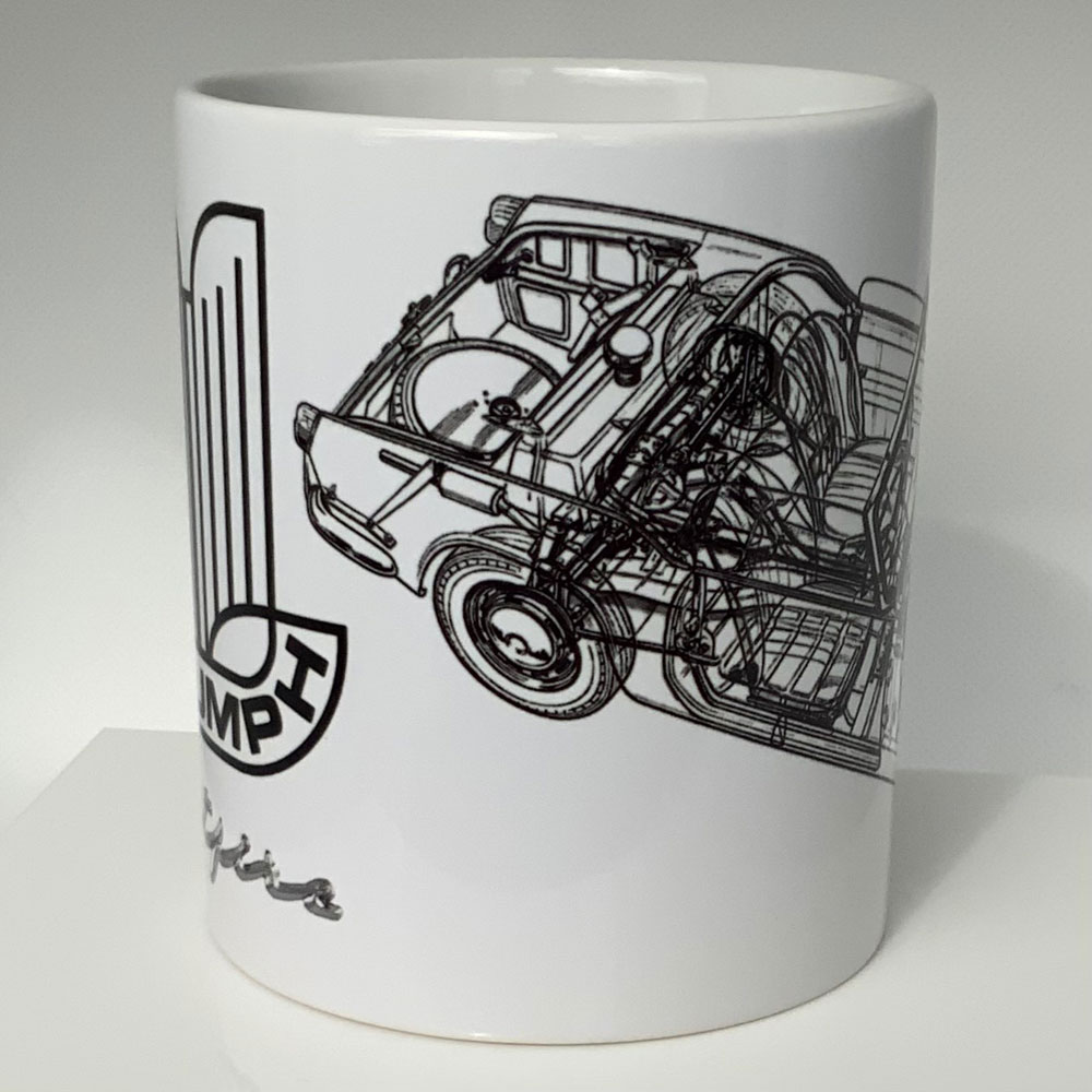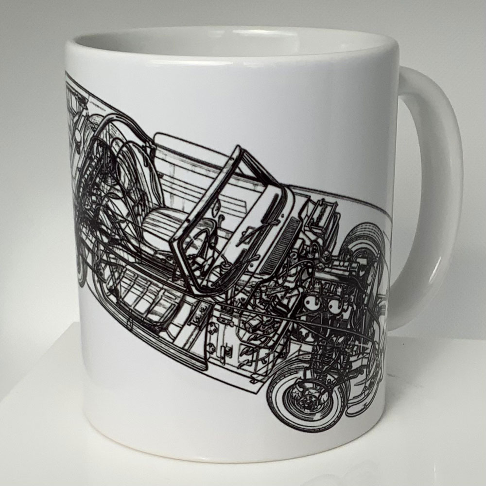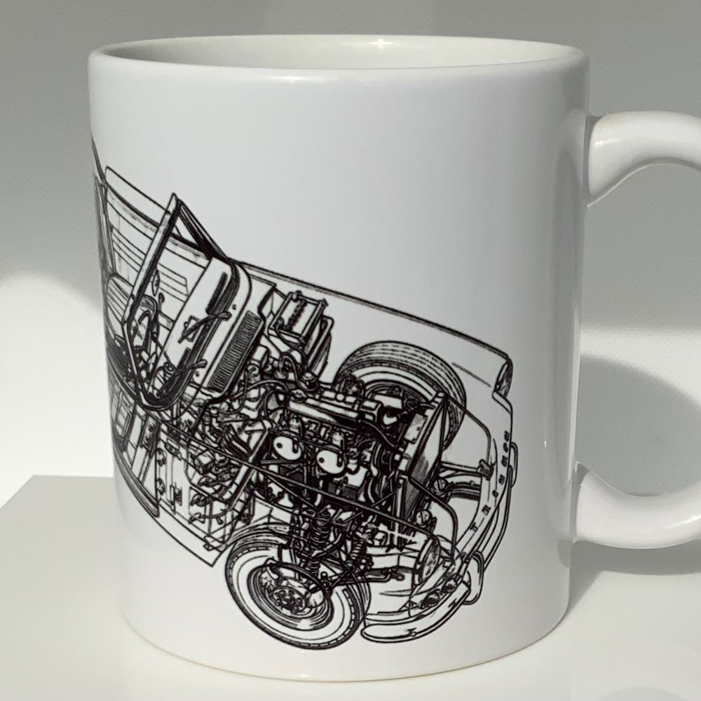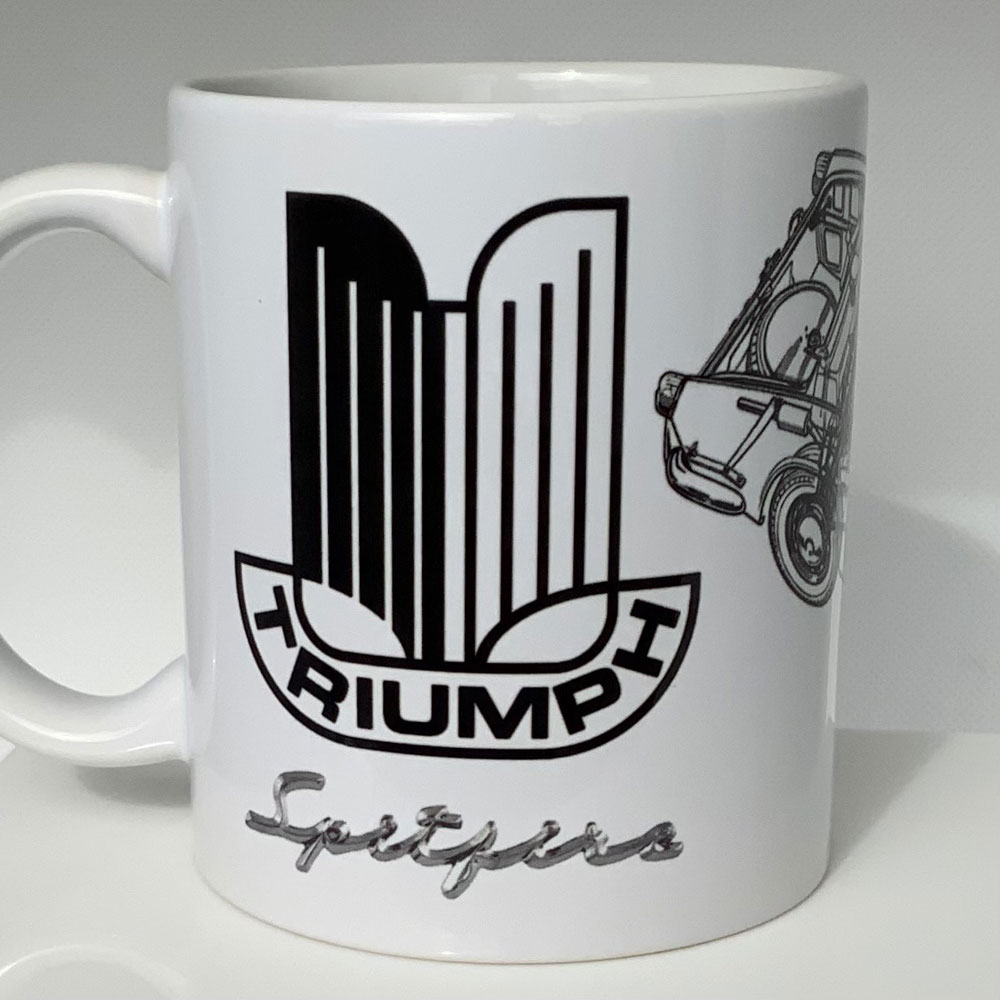 This is a great enthusiast mug for the Triumph Spitfire. This wraparound design mug features the classic Triumph Logo and Spitfire badge, along with a cutaway / x-ray type image of the car (as pictured).