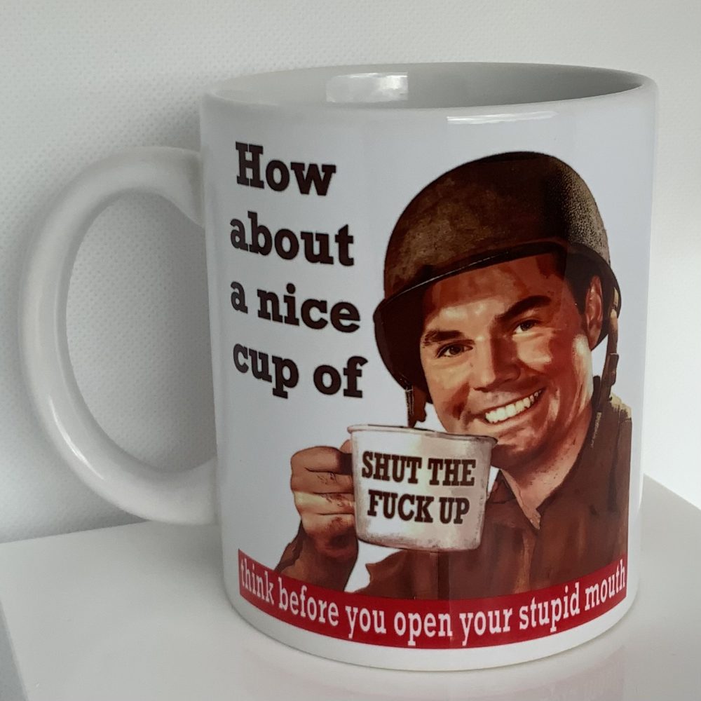 How about a nice cup of shut the fuck up – think before you open your stupid mouth – Funny mug gift for a Friend, Colleague, Parent, perfect for work or home.