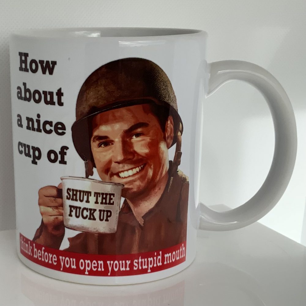 - FRONT : Features the text ‘How about a nice cup of shut the fuck up – think before you open your stupid mouth’ along with an old fashioned soldier picture (as pictured)