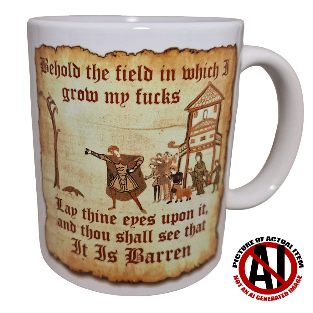 This Field of Fucks Mug is inspired by the Bayeux Tapestry and related meme and is the ideal gift for a friend, as a present, or for yourself! Ideal for home, or office.  This mug features the tapestry picture with the text “Behold the field in which I grow my fucks”….