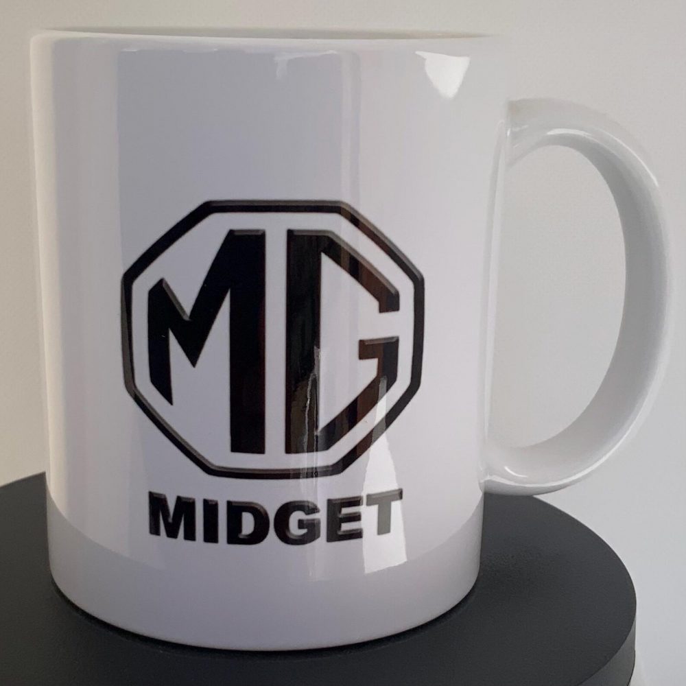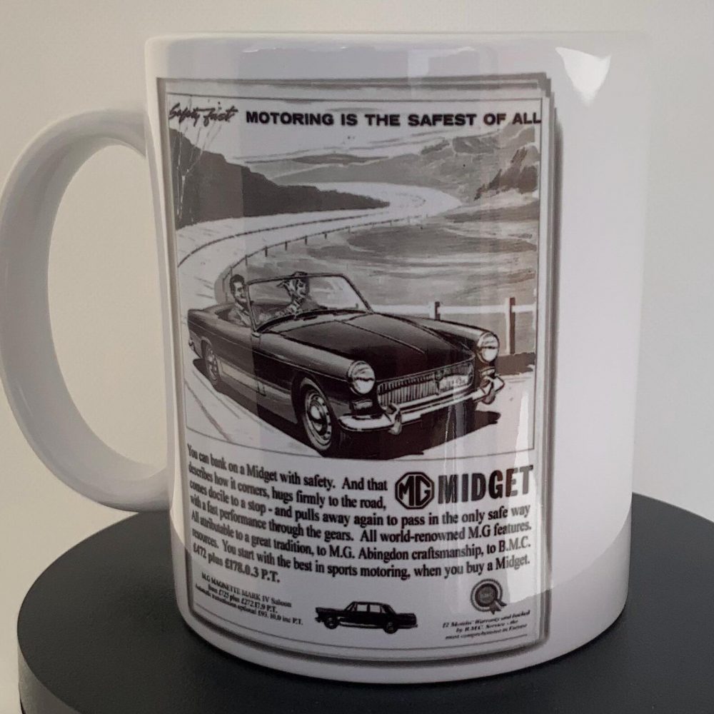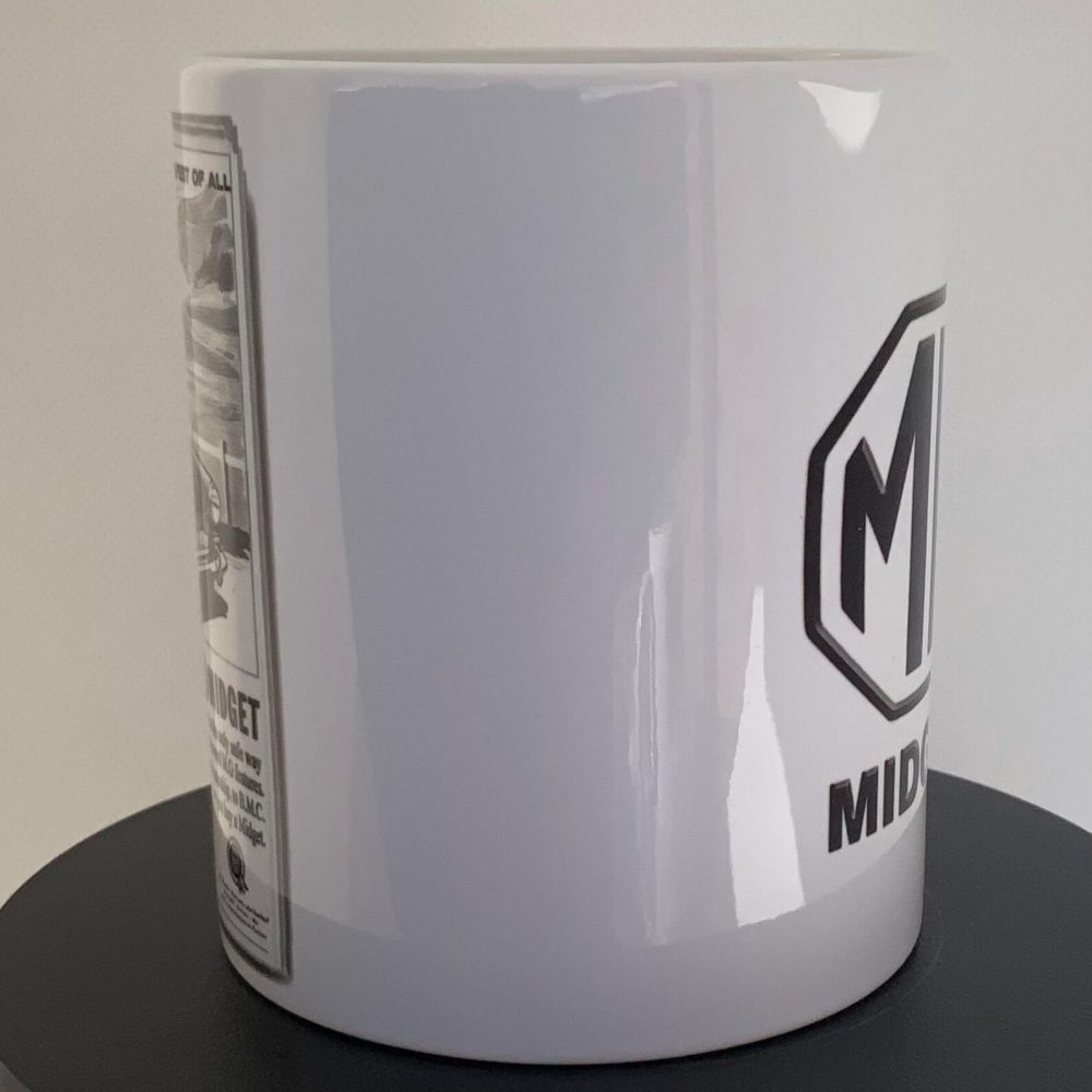 This mug features a reproduction of an original advert for the Classic MG Midget with the MG Logo.
