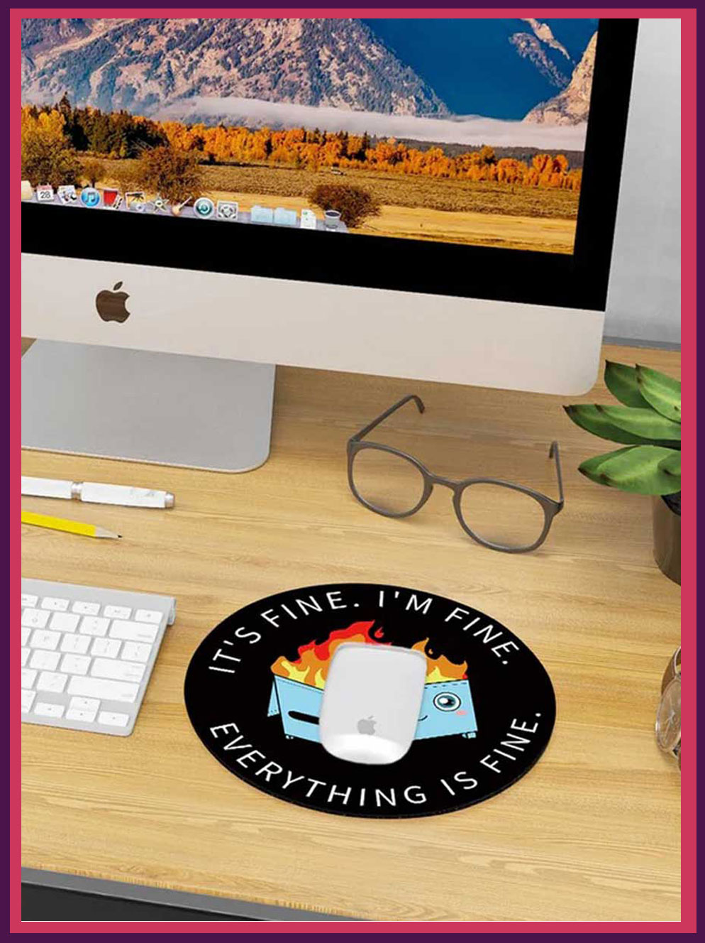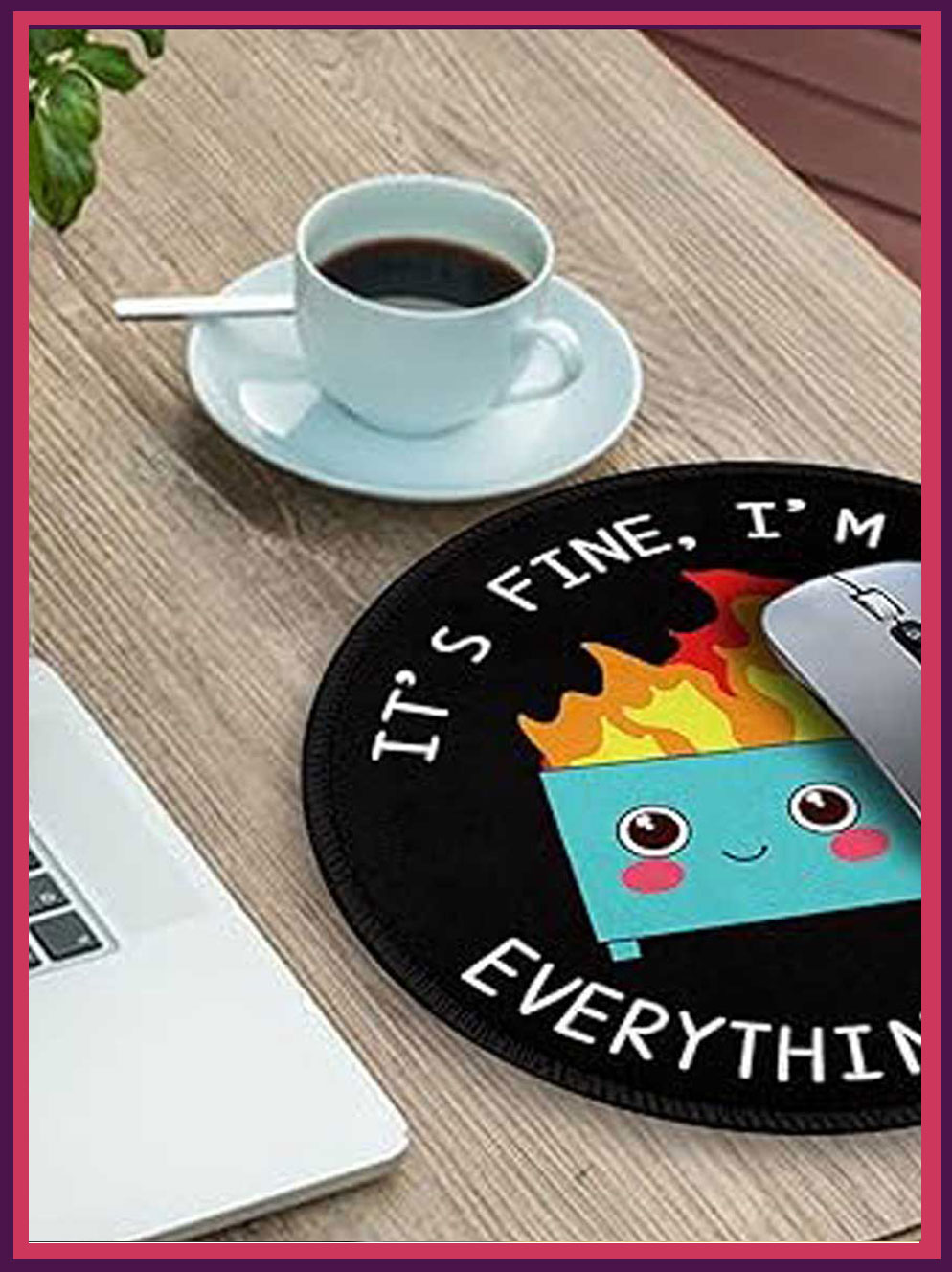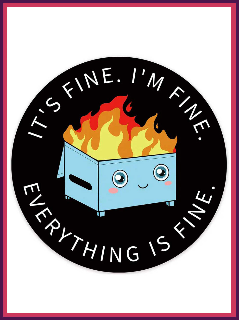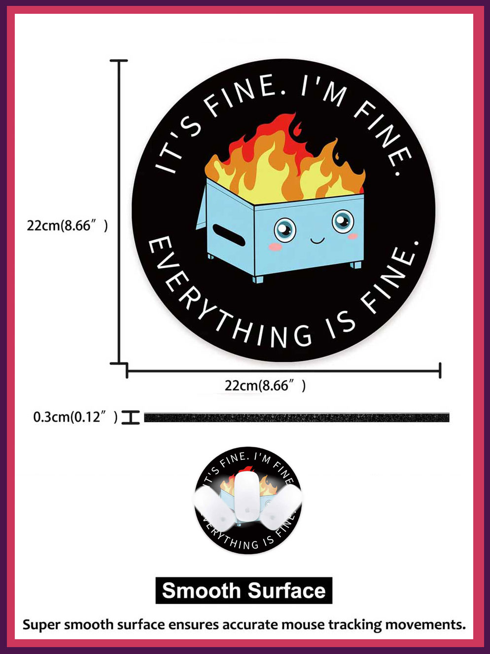 - This cute mouse pad is designed with funny Dumpster on Fire arts: It’s Fine I`m Fine Everything is Fine. The cute and funny mousepad will always bring more happiness and fun to your life. You will get tons of comments on it.