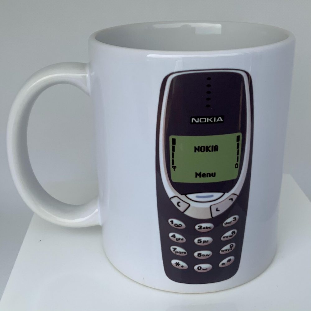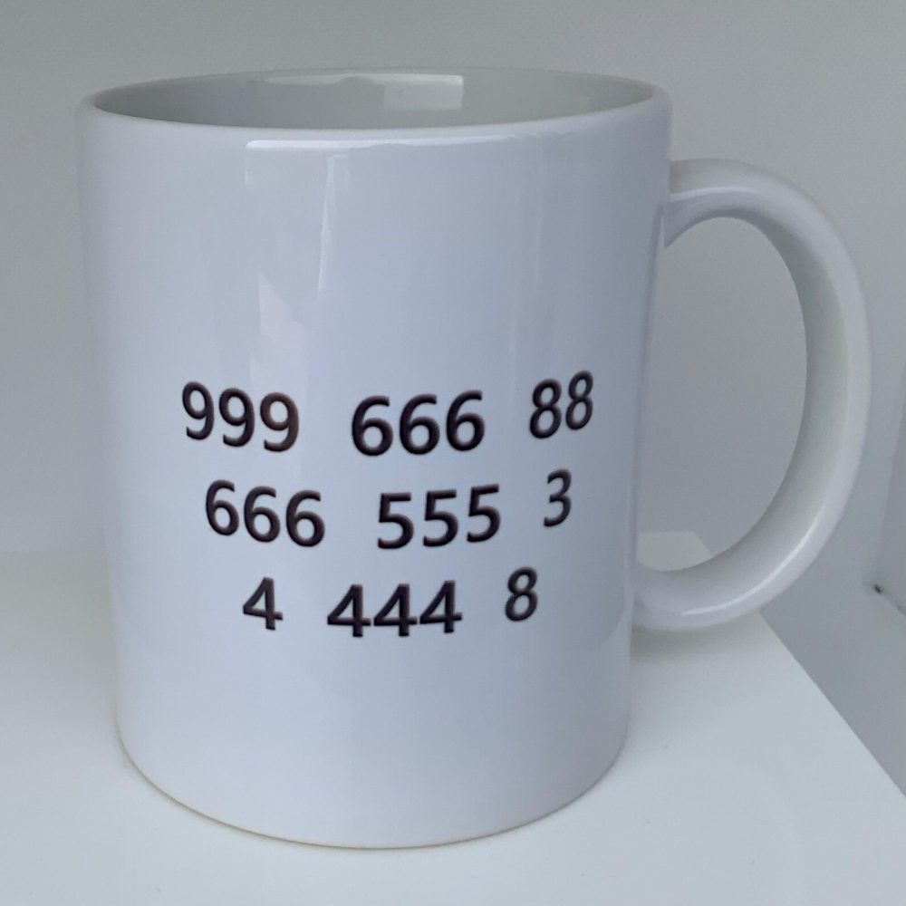 This mug features a picture of a retro Nokia phone which has a sequence of numbers to form a text message.