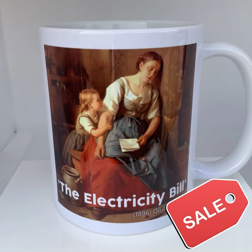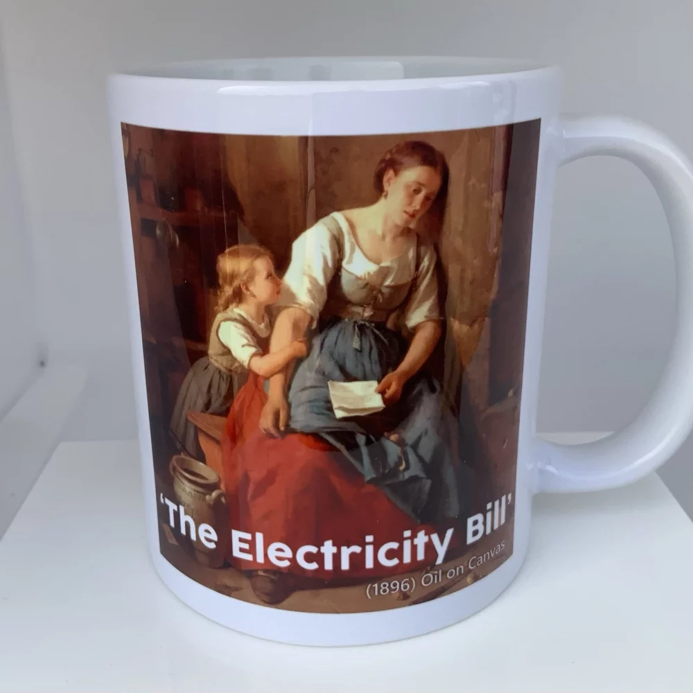 This mug features a picture of a child and woman holding a letter with the text ‘The electricity bill – (1896) Oil on Canvas’.