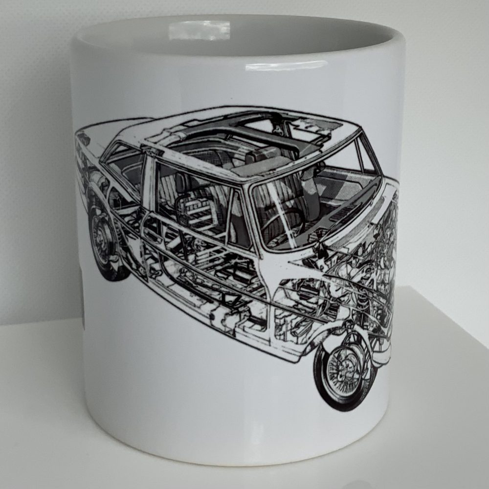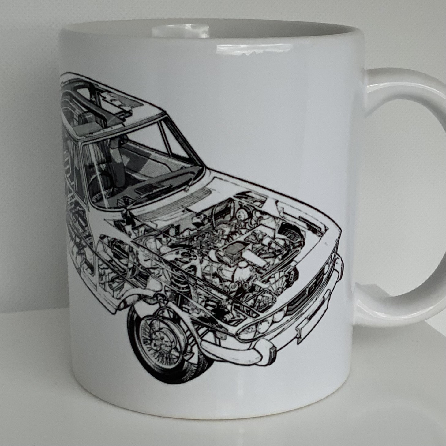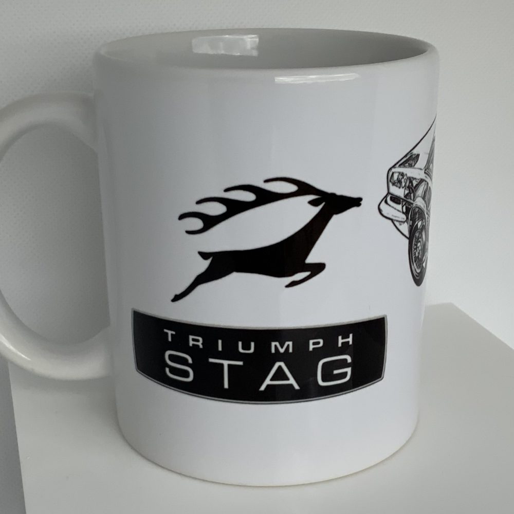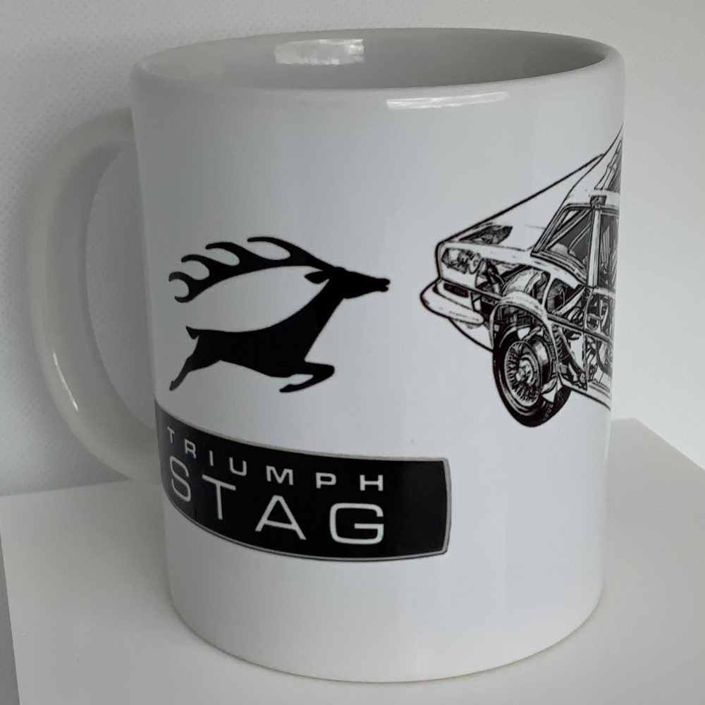 This is a great enthusiast mug for the Triumph Stag. This wraparound design mug features the classic stag badge, along with a cutaway / x-ray type image of the car (as pictured).